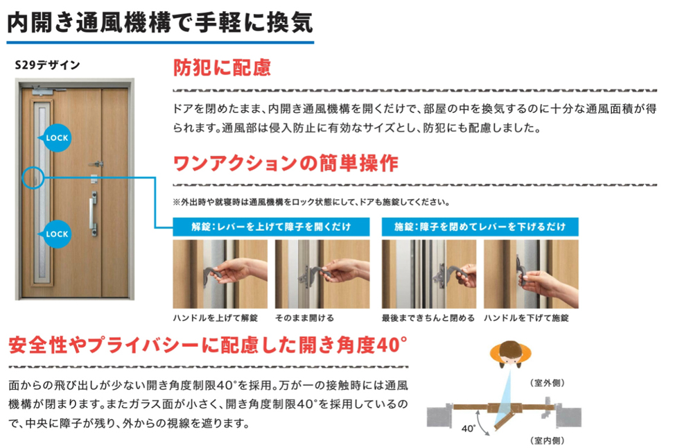 ドアを閉めたまま換気することが出来るので防犯面も配慮してあり、