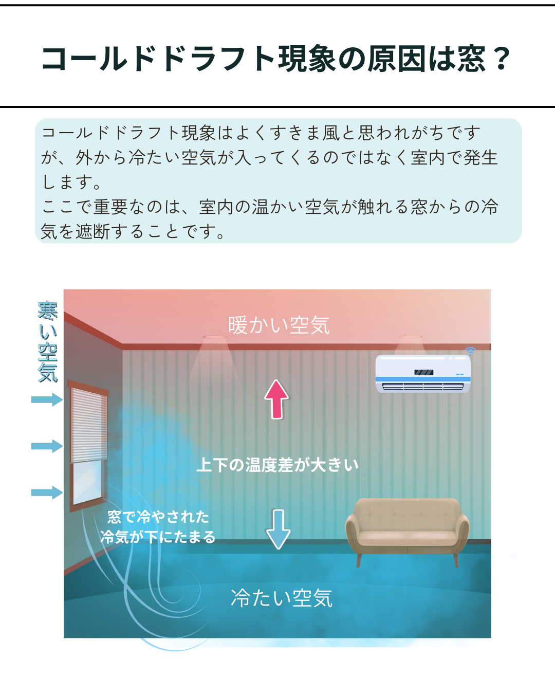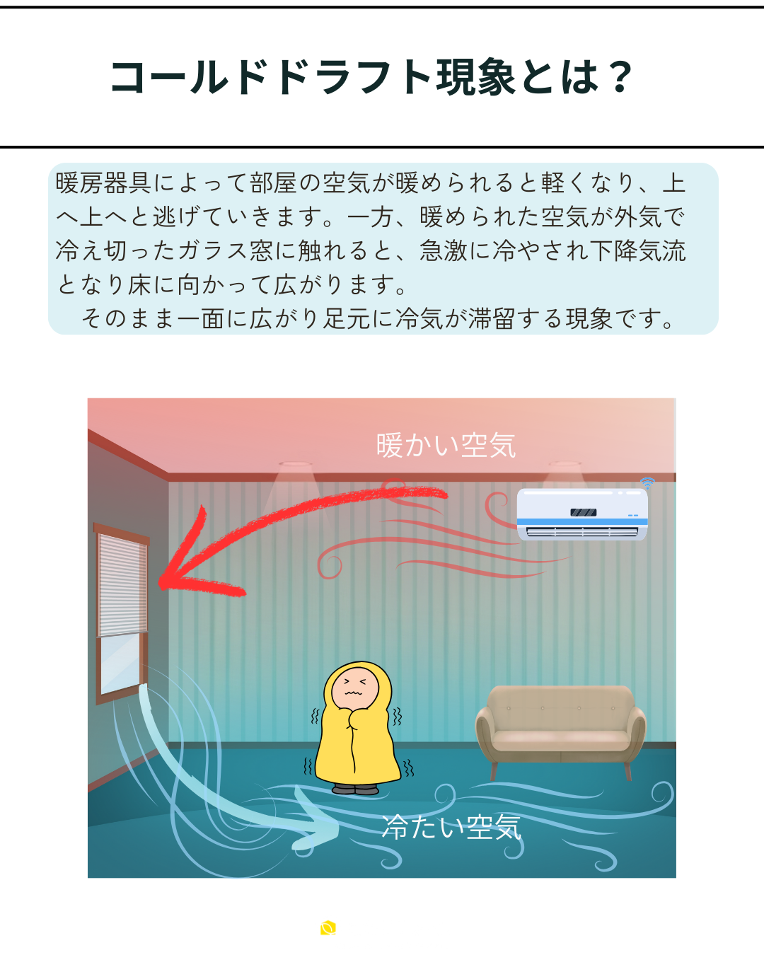 窓などで冷やされた空気が下へ流れ落ち、室内に冷気の流れが生まれる現象のことです。