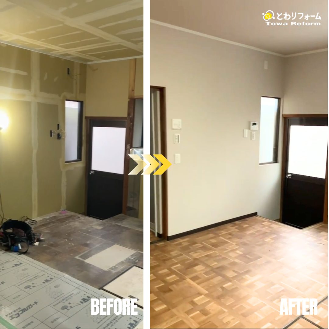 今回、LDKは壁・天井のクロス貼り替えと、床にはウッドタイルを採用しました。
