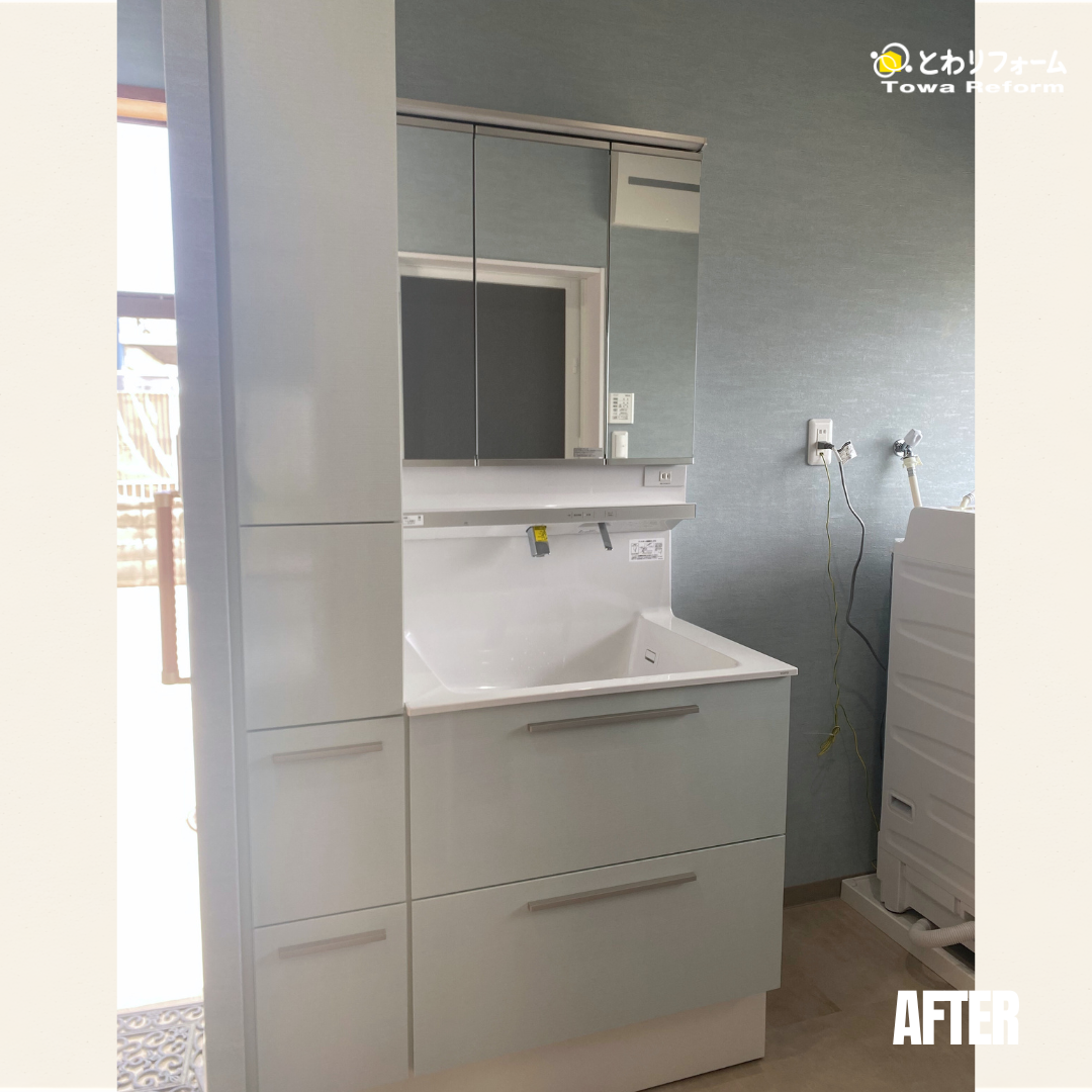 最後まで悩んでおられた壁紙クロスも、洗面台のカラーと馴染んでスッキリオシャレな空間へと生まれ変わり、大満足なリフォームとなりました。