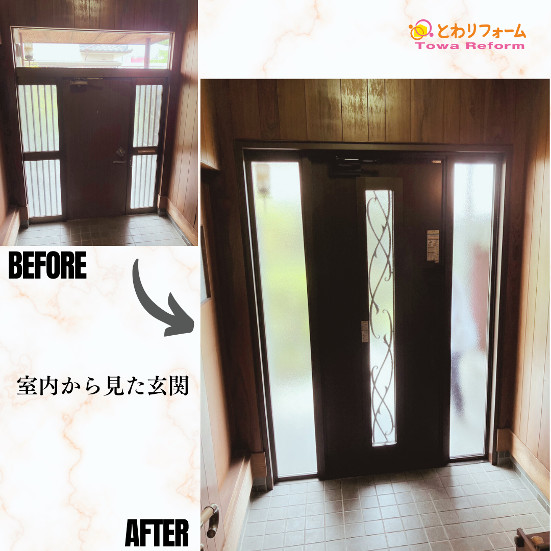 既存の玄関ドアは上部にランマがあり、薄暗い玄関室内の明りとりとしての役目も担っていました。しかし、断熱性能の低い玄関ドアであるため外気の温度が室内に伝わり、夏は暑く冬は底冷えするような寒さの原因となっていました。