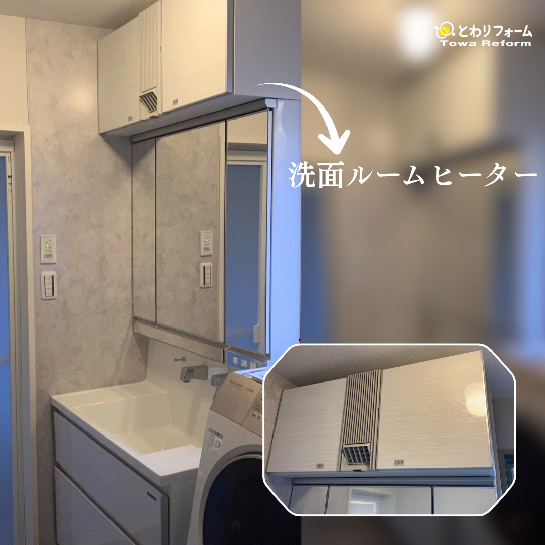 また、北側に位置し寒さが気になっていた洗面室には、洗面台一体型の洗面ルームヒーターを設置。