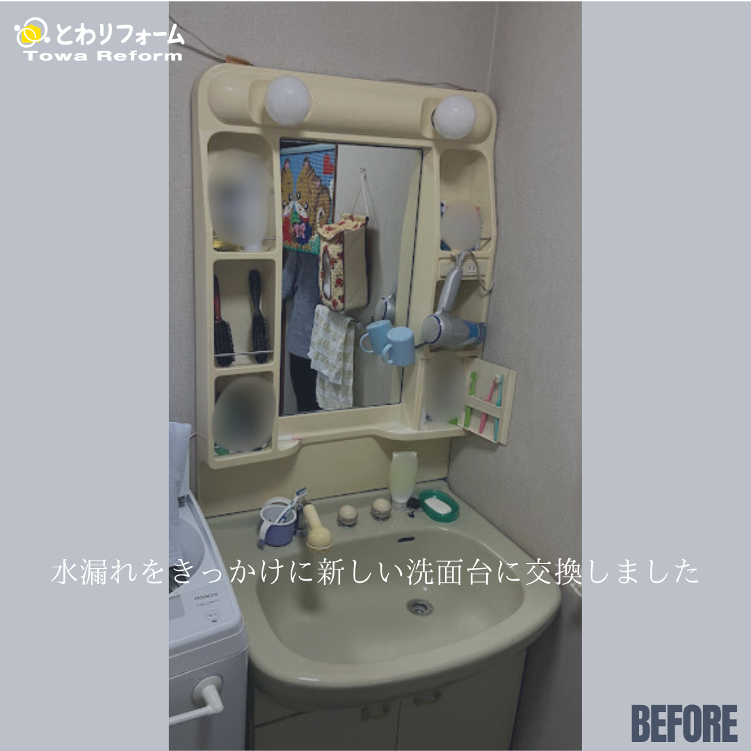 担当者コメント/OBのお客様からのご紹介で、水漏れをきっかけに洗面化粧台交換のご依頼をいただきました。