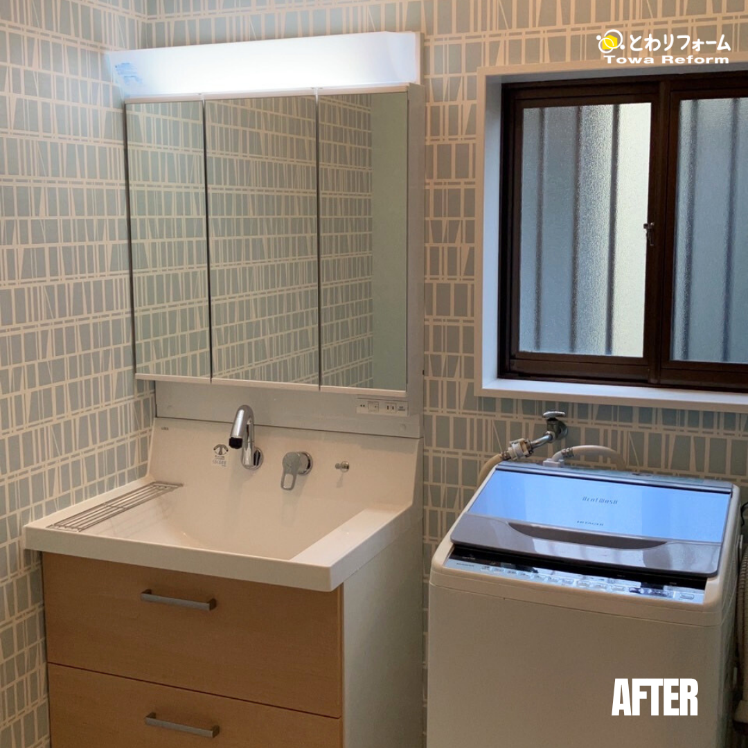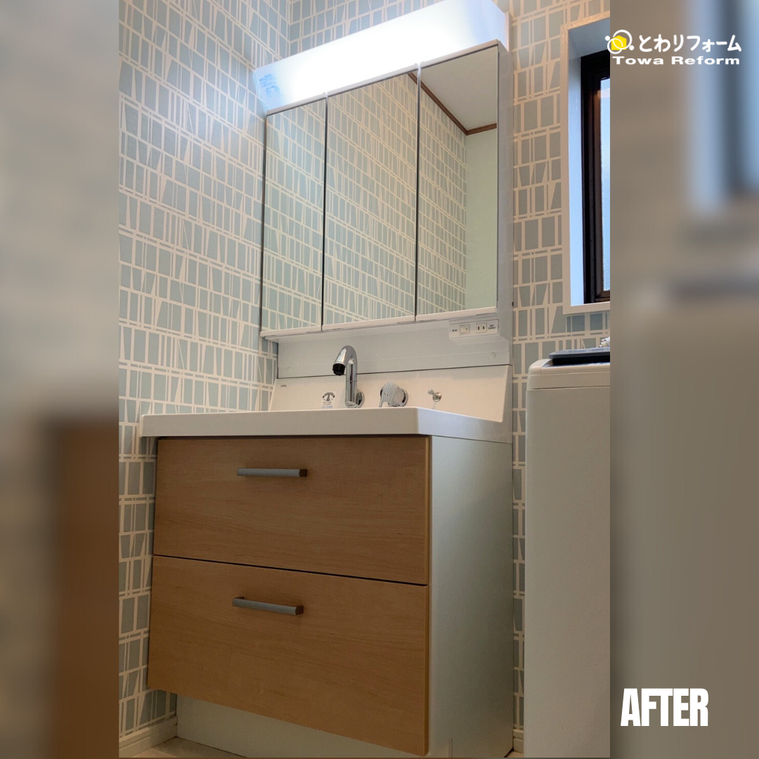 脱衣所の壁クロスもお客様がじっくりとお選びいただき、バスルームと統一感のある雰囲気に仕上がりました。