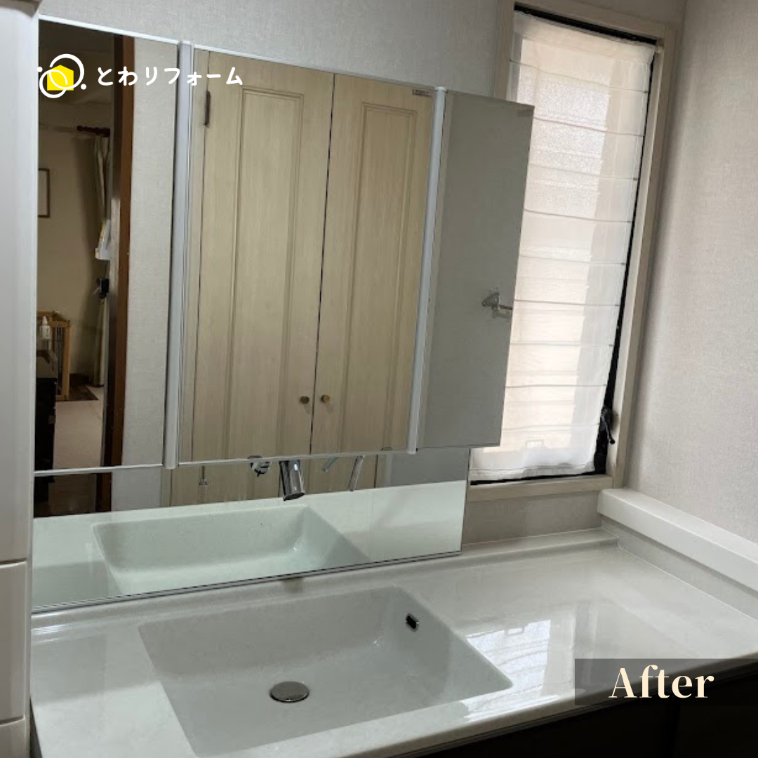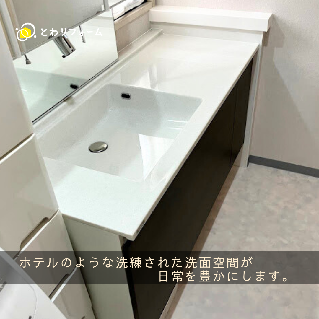 洗面化粧台は、収納スペースが広く、使いやすい工夫が施されています。キャビネット内には仕切りやトレイが設けられており、日用品の整理整頓が簡単です。