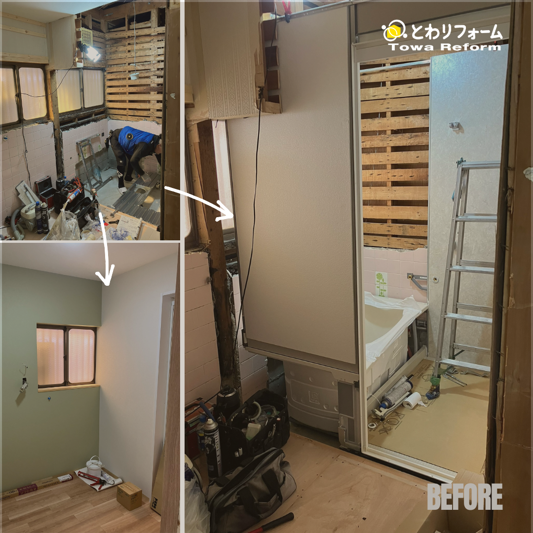浴室と脱衣所の間に壁を新設していきます。以前は小さめの浴槽でしたが、壁ぎりぎりまで浴槽を広げます。