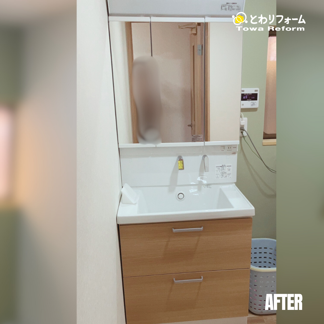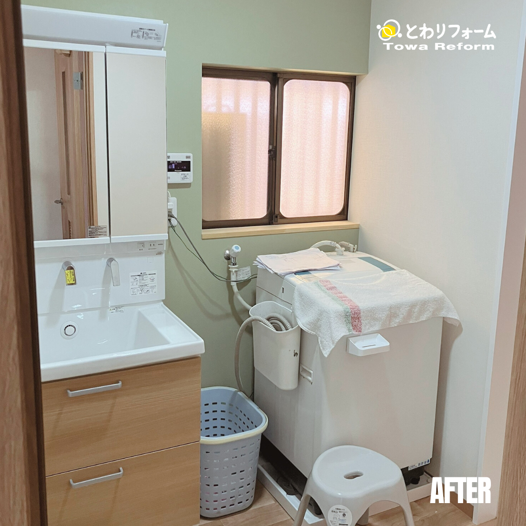 洗面脱衣所は、タイルの床からクッションフロアに貼り替え、クロスはキッチンのアクセントクロスと同色のグリーン系を一面の壁のみ貼り、家のトータルコーディネートとして統一感をもたせました。