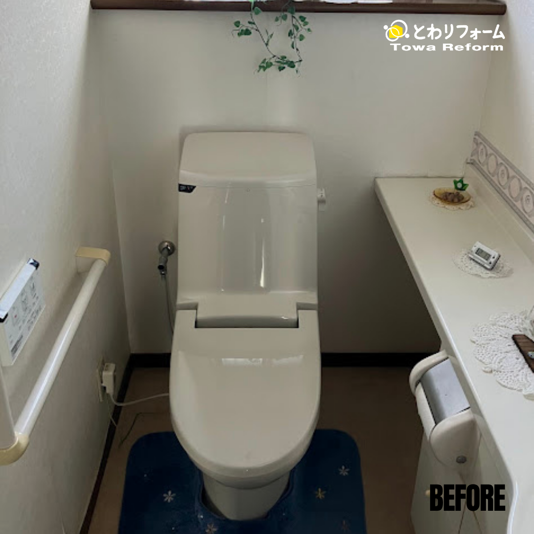 以前のトイレはタンク付きの一体型トイレでしたが、今回水回りを中心とした改修工事の際に経年劣化したトイレをタンクレストイレに交換しました。