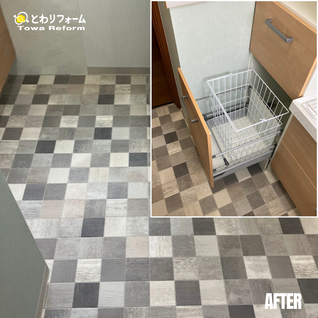 脱衣所の床は、グレーを基調としたモザイク調のクッションフロアに貼り替え、浴室のアクセントパネルとの統一感もでました。