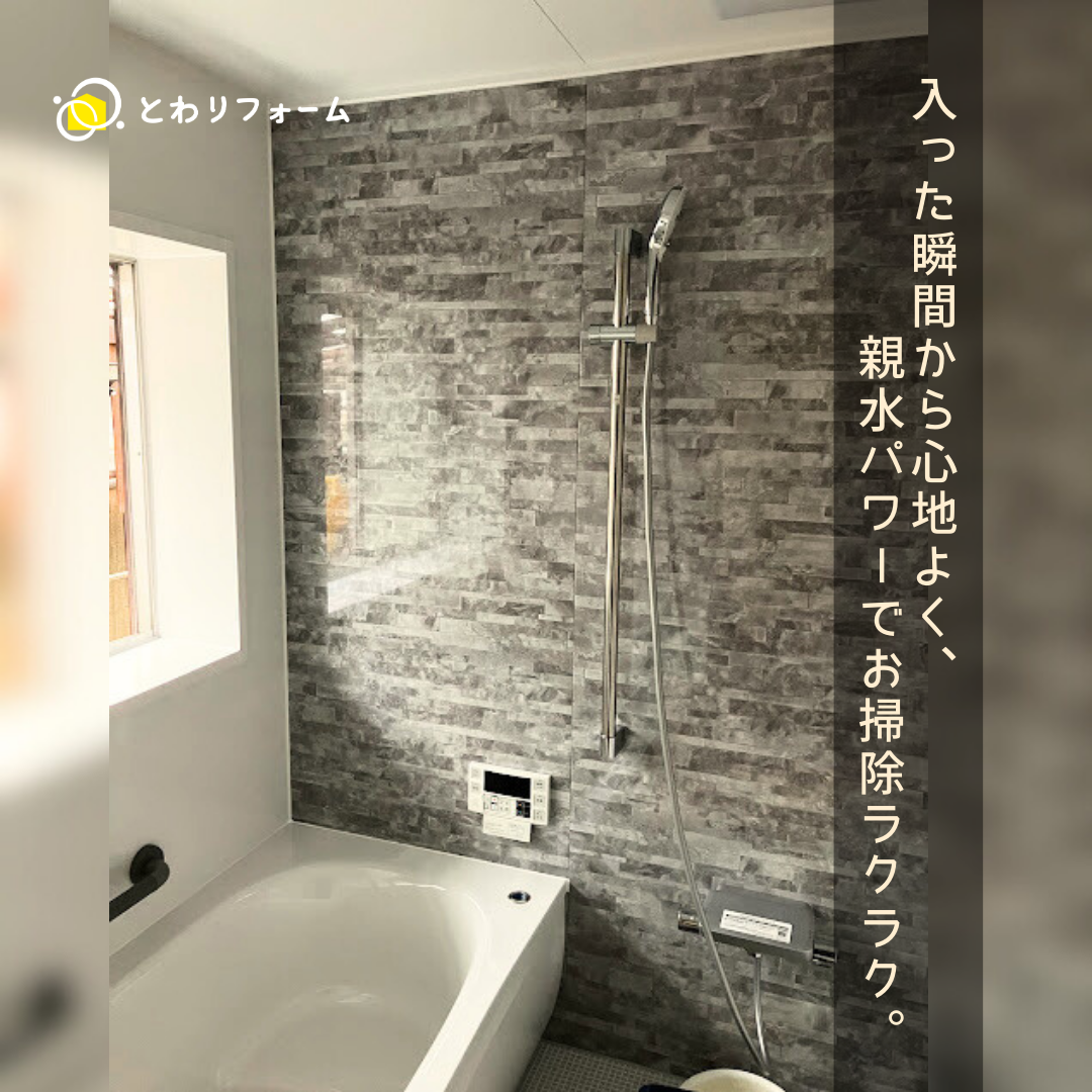 クリーン技術:浴室全体に汚れが付きにくい仕様で、掃除の手間を減らす工夫がされています。排水口や壁、ドア部分も清潔を選びやすい設計です。