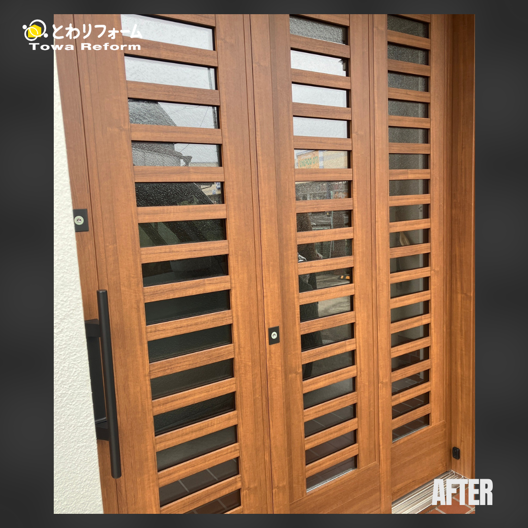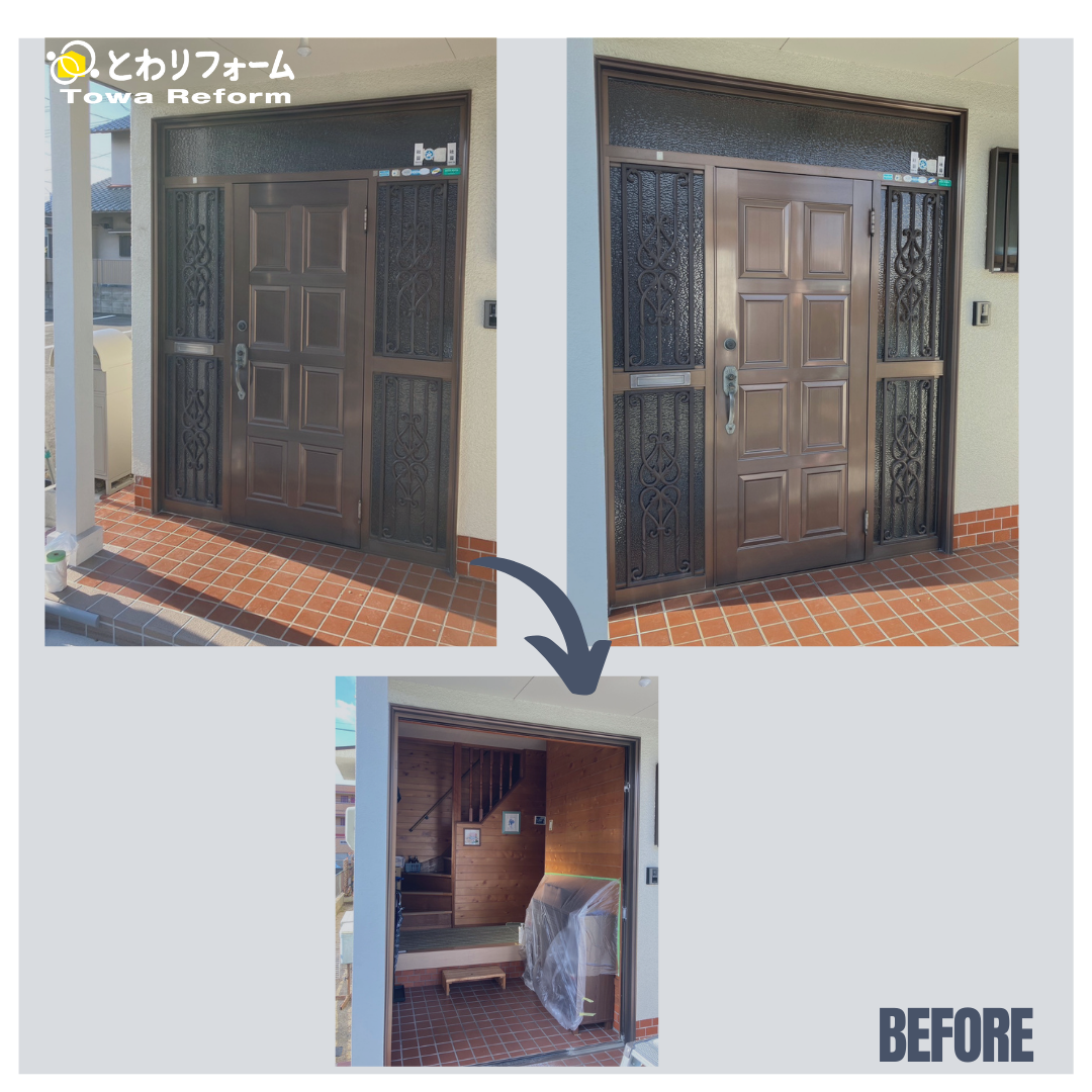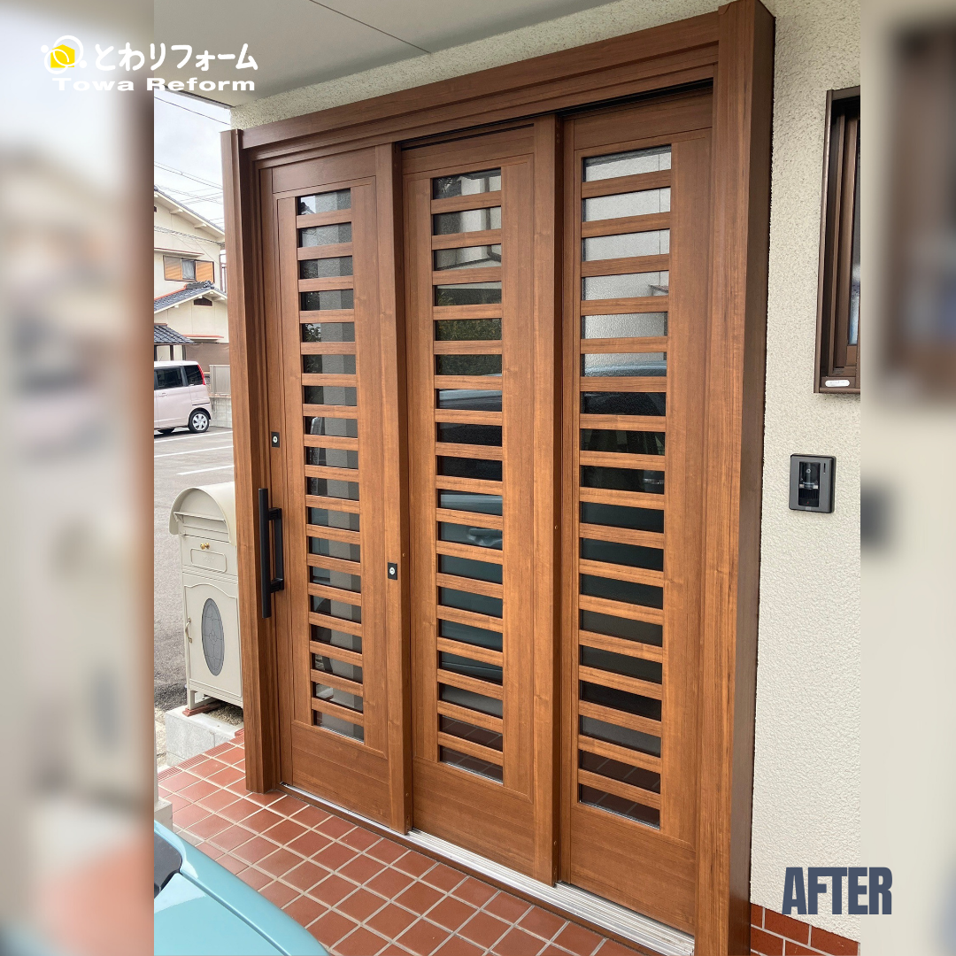 担当者コメント/玄関前が駐車場となっていて、玄関ドアを開けるとすぐ目の前に駐車している車があり、距離が近くて玄関の出入りに不便に感じておられました。当初はアウトセットの引戸のお見積りをご提案していましたが、実際に現場を確認したところ、ドアは両袖タイプでランマもついている大きな玄関だったため、アウトセットではなく、今回施工させていただいた袖付き2枚連動引込み戸をご提案いたしました。