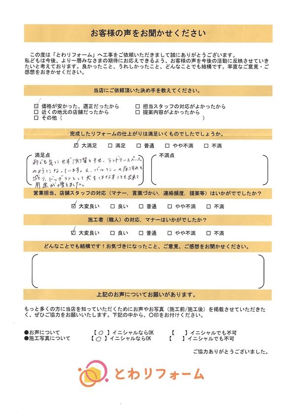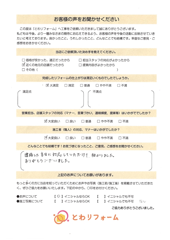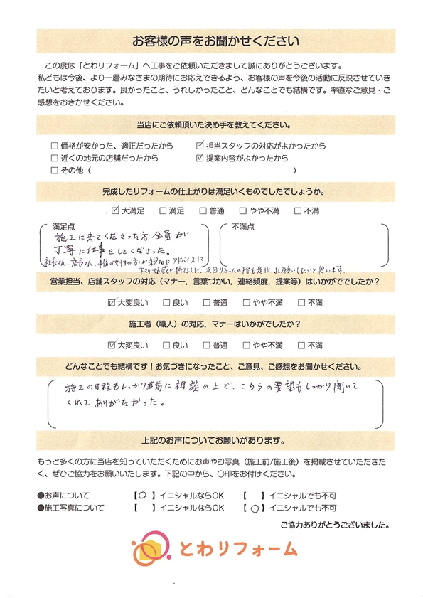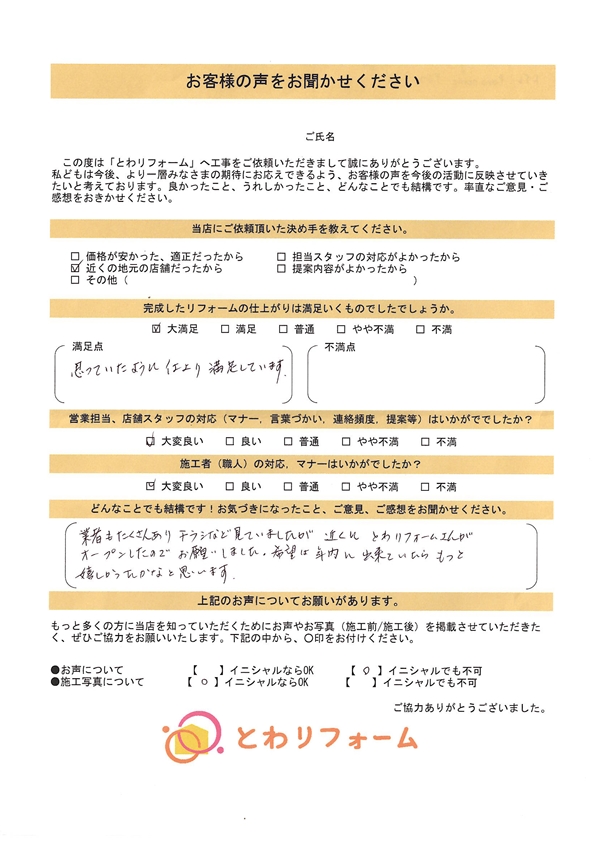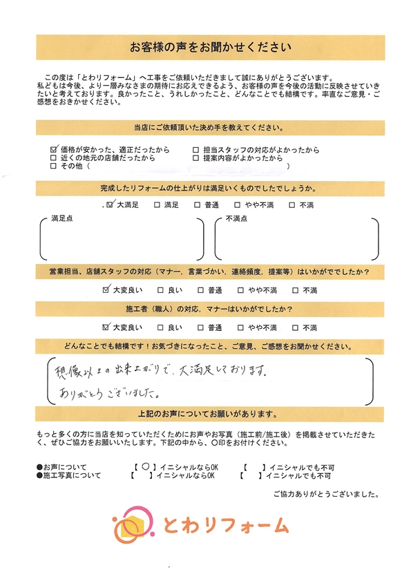 | A. | 大満足。施工に来て下さった方 全員が丁寧に仕事をしてくださった。 社長さん、店長さん、事務の女性の方が親切にアドバイスして下さり好感が持てました。次回リフォームの際も是非お願いしたいと思います。 |