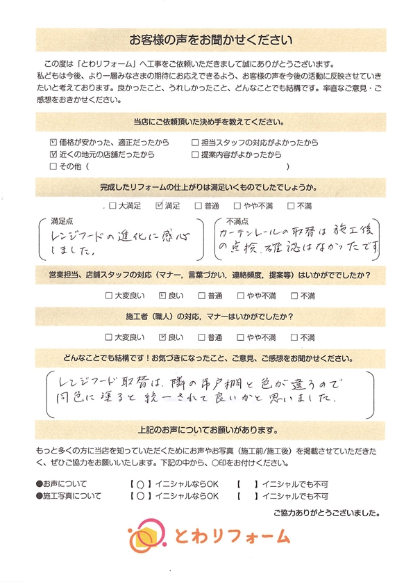 | A. | 満足 満足点:レンジフードの進化に感心しました。 不満点:カーテンレールの取替は施工後の点検・確認はなかったです。 |