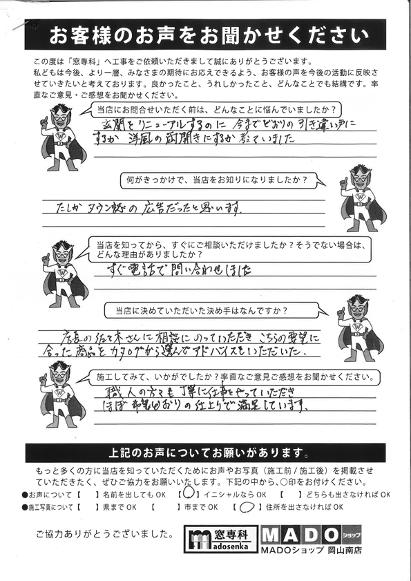 | A. | この度はありがとうございました。リビング窓だったのでシャッターがつけられてとても安心しました。こちらの都合もあり支払いから施工まで時間がかかりましたが、無事終わって良かったです。次回はもう少し施工時間や商品説明など打ち合わせの時間を増やせたら、更に嬉しいです。今後ともよろしくお願いいたします |