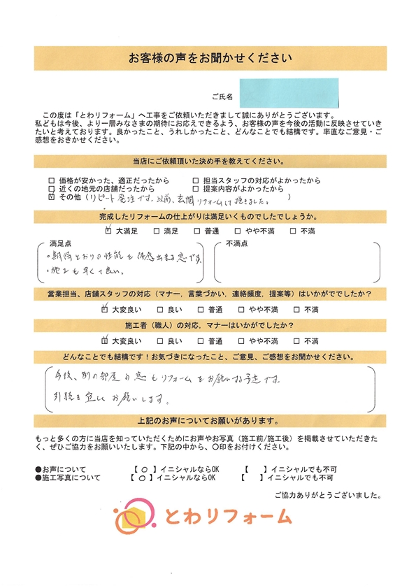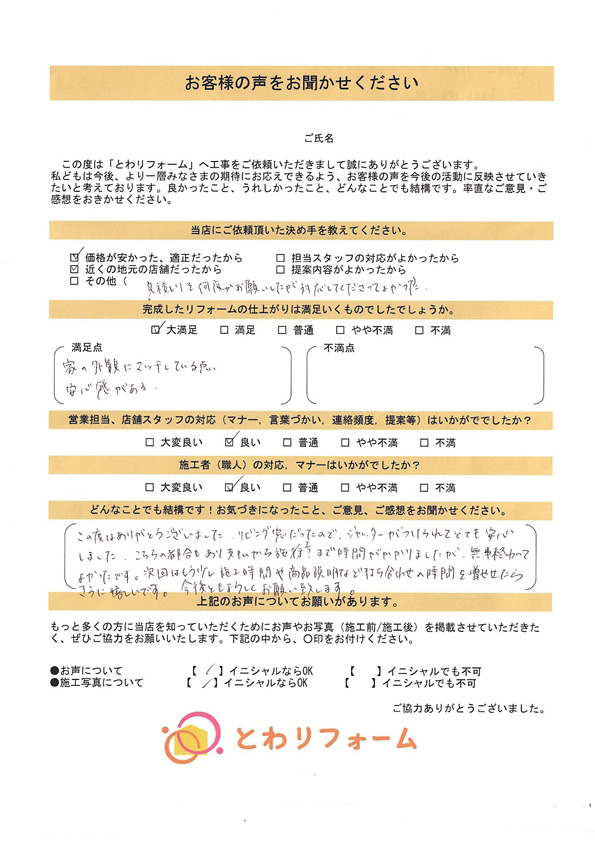| A. | 業者もたくさんありチラシなど見ていましたが近くに とわリフォームさんがオープンしたのでお願いしました。希望は年内に出来ていたらもっと嬉しかったかなと思います。 |