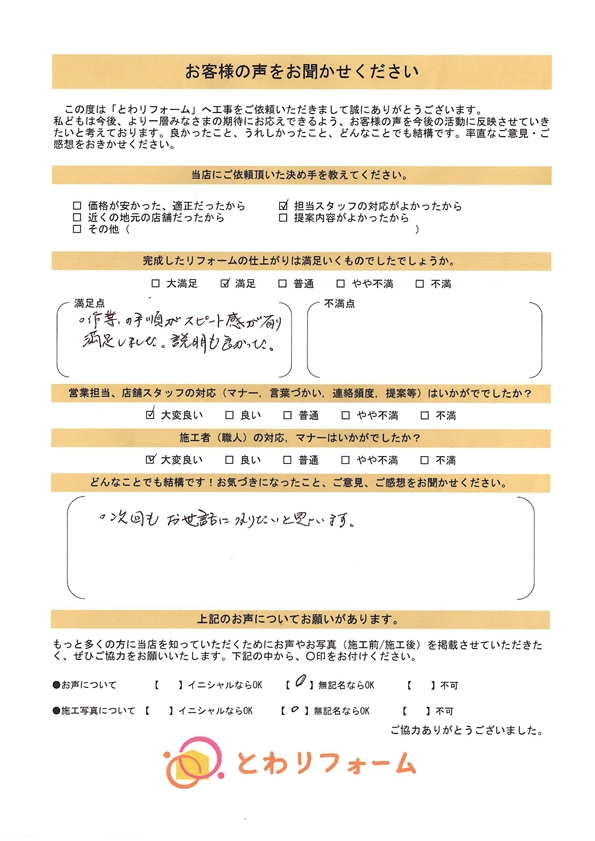 | A. | 満足。 作業の手順がスピード感が有り満足しました。説明も良かった。 |