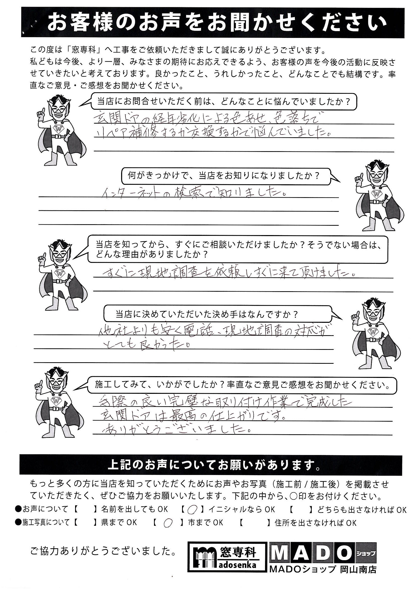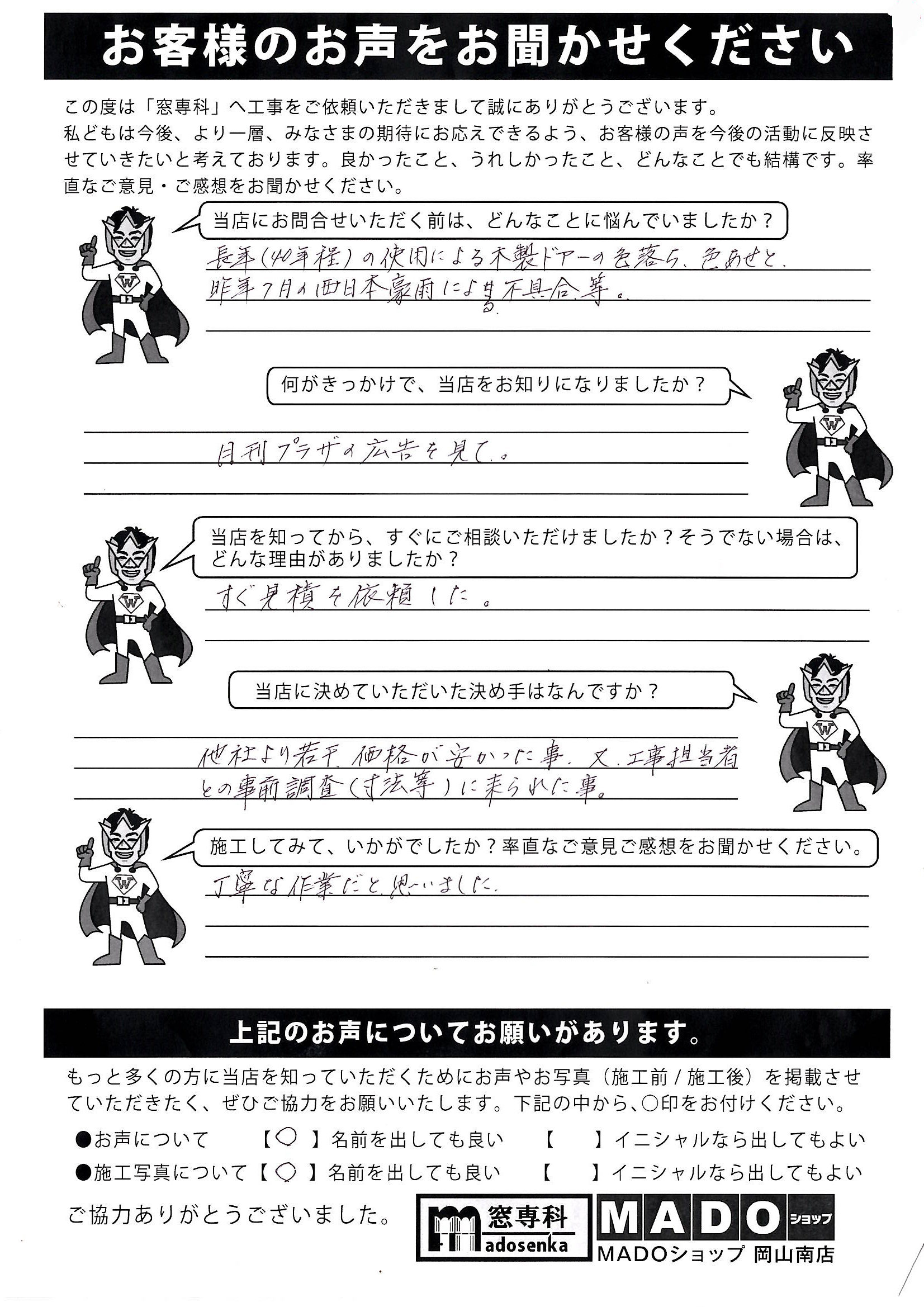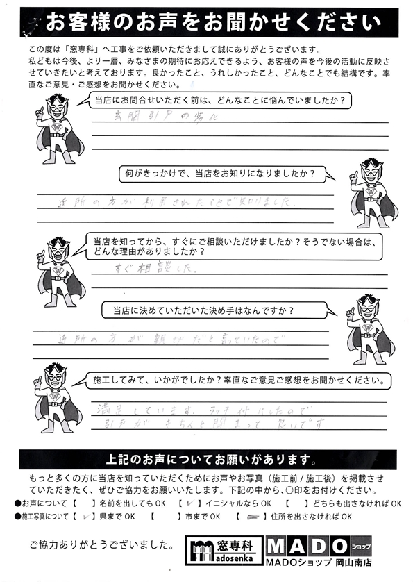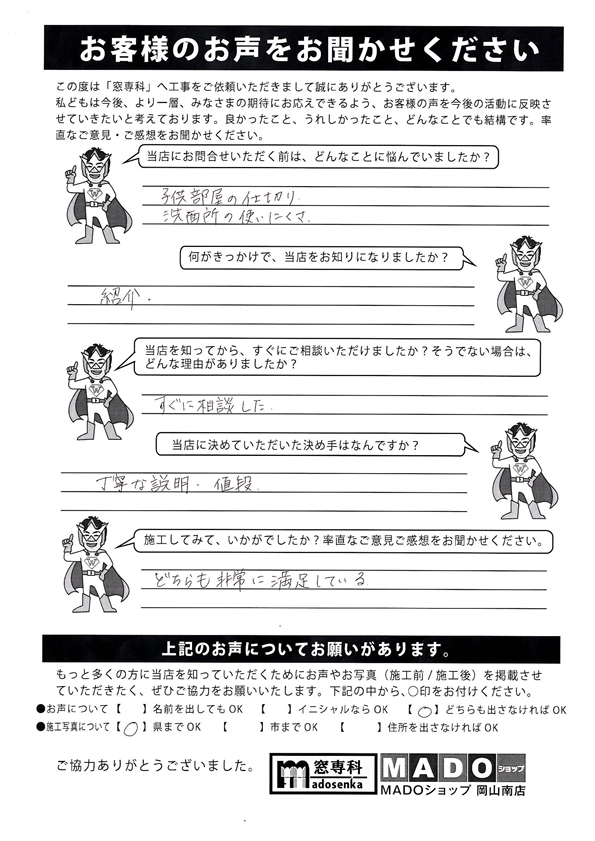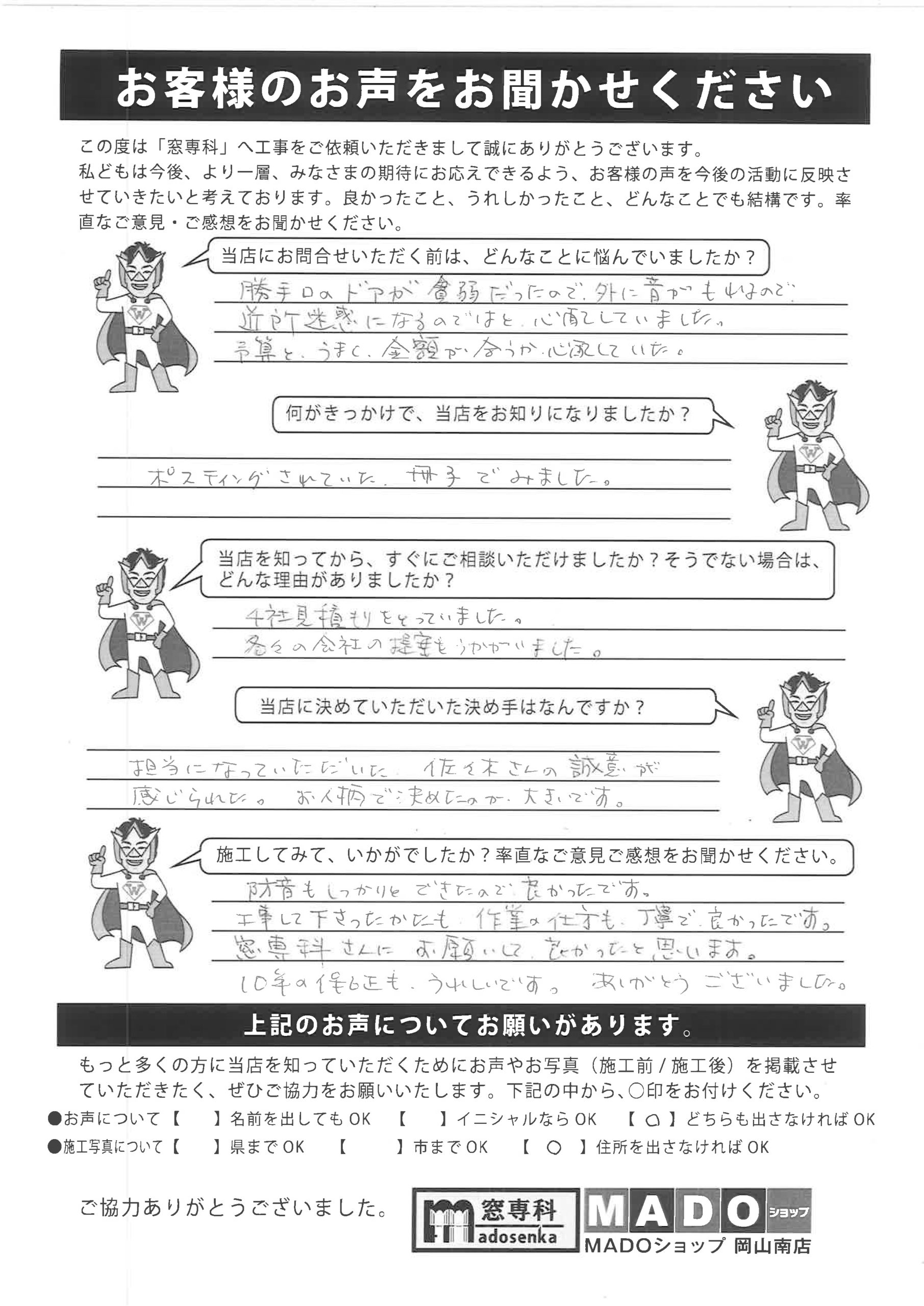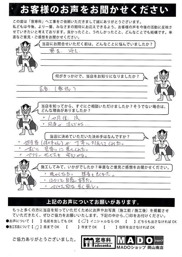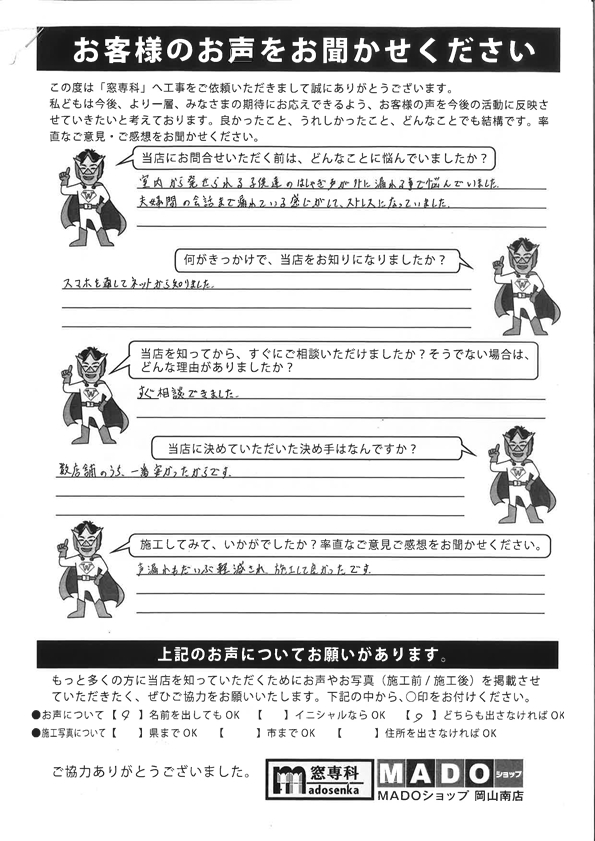 | A. | 防音もしっかりとできたので良かったです。工事してくださったかたも作業の仕方も丁寧で良かったです。窓専科さんにお願いして良かったと思います。10年保証もうれしいです。ありがとうございました。 |