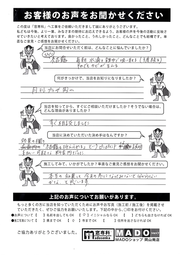 | A. | ひどい結露で毎朝水滴を雑巾で3度も吸い取っていましたが、それでもカビが生える状態でしたので、「結露も抑えられる」というピンポイント説明と、支払い可能な料金内だった事が決め手です。 |
