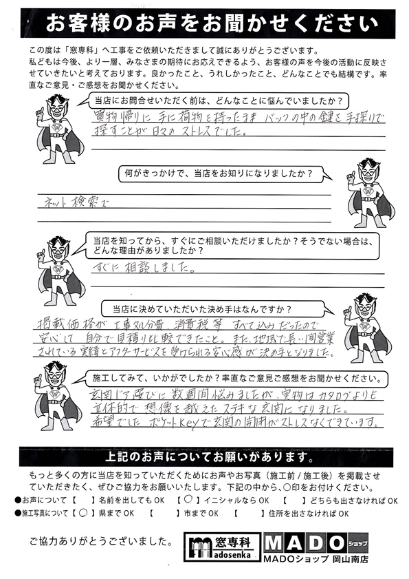 | A. | 玄関ドア選びに数週間悩みましたが、実物はカタログよりも立体的で想像を超えた素敵な玄関になりました。 希望でしたポケットKeyで玄関の開閉がストレスなくできています。 |