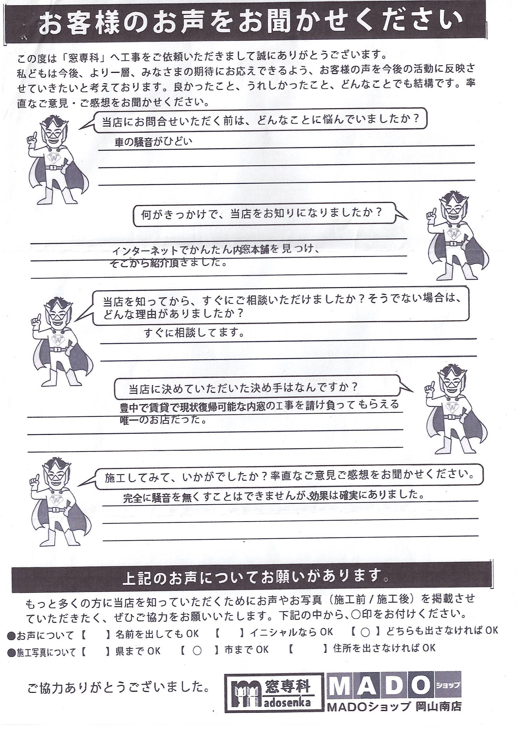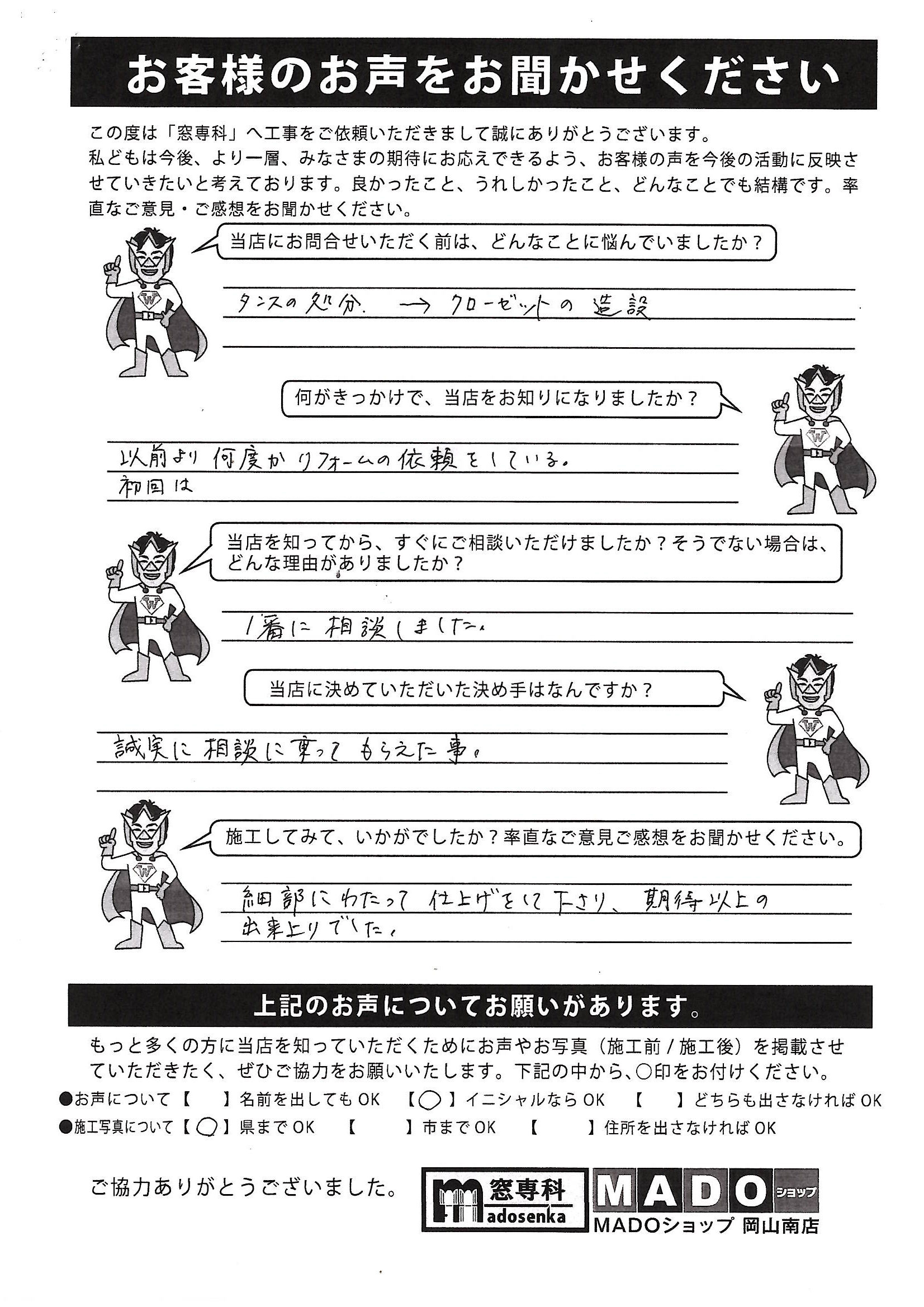 | A. | 業務の方が取り付けた時も担当の方が見に来てくださり、また、気になったところもすぐ直してくださり、お願いして良かったと思っています。 |