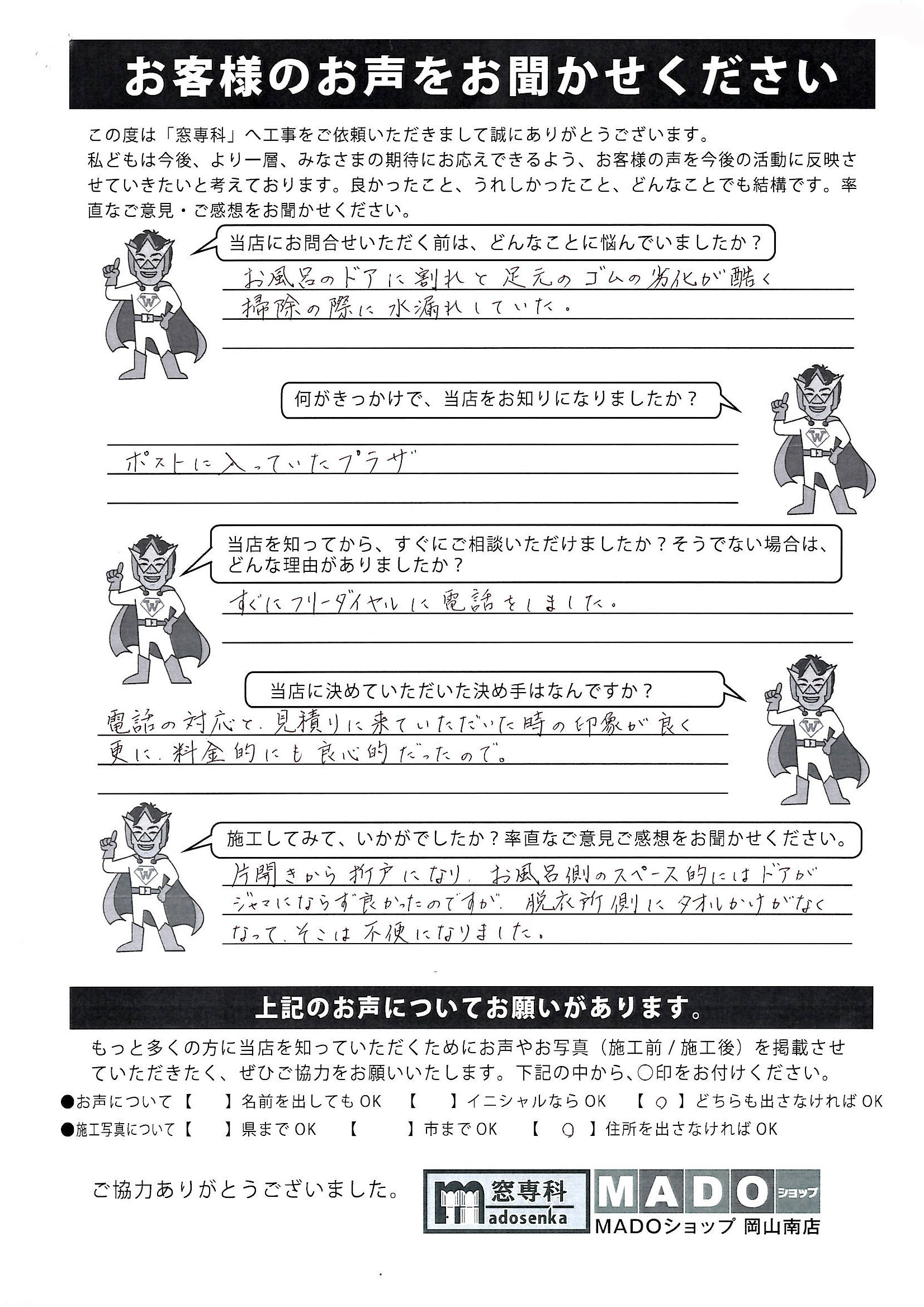 | A. | 片開きから折戸になり、お風呂側のスペース的にはドアがジャマにならず良かったのですが、脱衣所側にタオルかけがなくなって、そこは不便になりました。 |